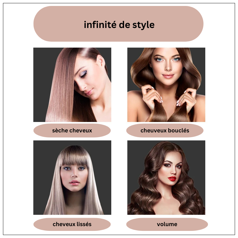 Les ions négatifs saturent le flux d'air. Cela aide à conditionner, lisser et rendre les cheveux plus brillants, tout en réduisant les frisottis et l'électricité statique.